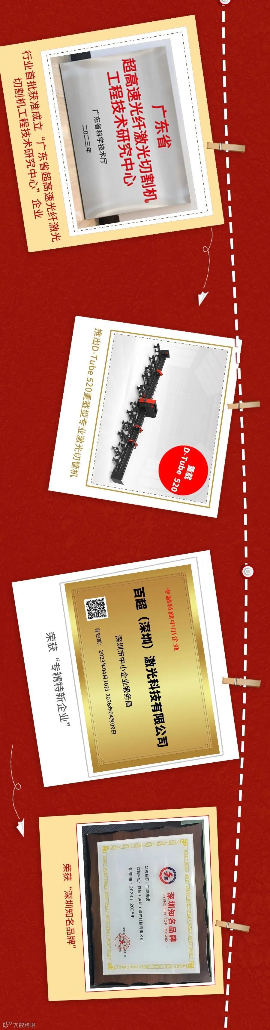 百超(深圳)激光科技有限公司(品牌名:“百超迪能”)为瑞士百超集团全资子公司,总部位于深圳,同时在上海设立了分公司。经过多年发展,百超迪能已成为一家集激光切割机、激光切管机、数控折弯机、自动化等装备于一体的智能制造系统化解决方案专业提供商。公司连续多年荣获国家高新技术企业,“深圳500强”企业、专精特新企业、“杰出本土化服务商&最具企业社会责任奖”企业、行业率先获得《智能制造成熟度水平二级认定》企业,同时于2023年被评选为“深圳知名品牌”。