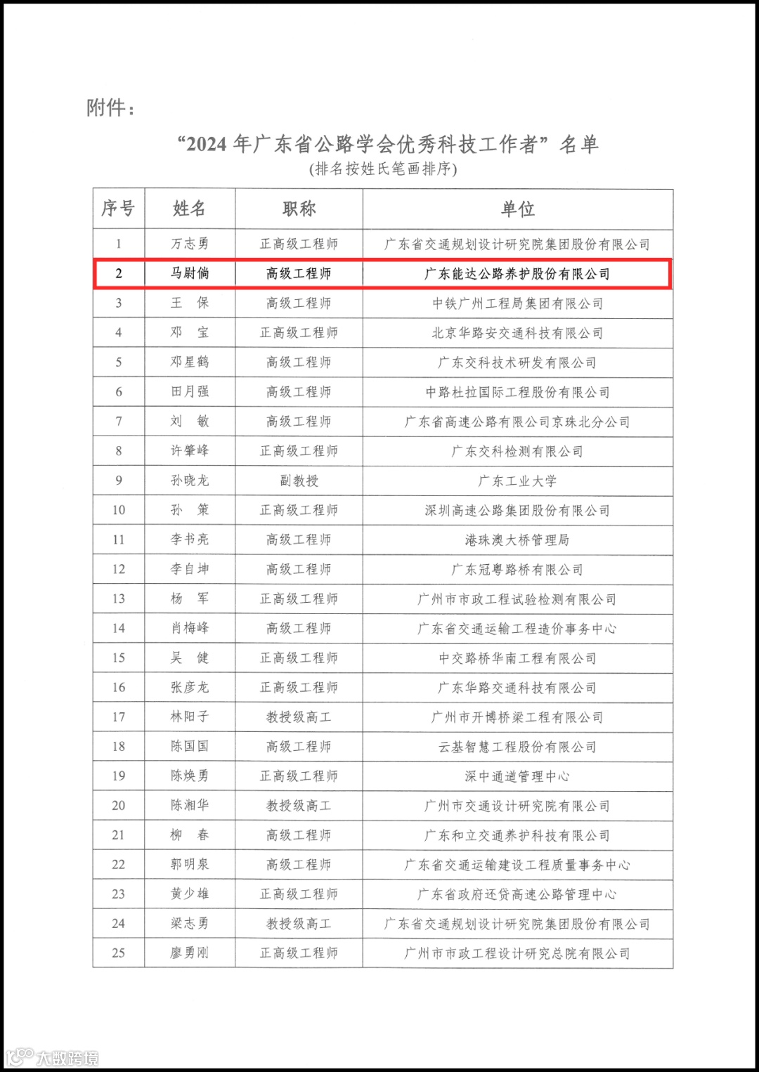 等25名同志“2024年广东省公路学会优秀科技工作者”荣誉称号。