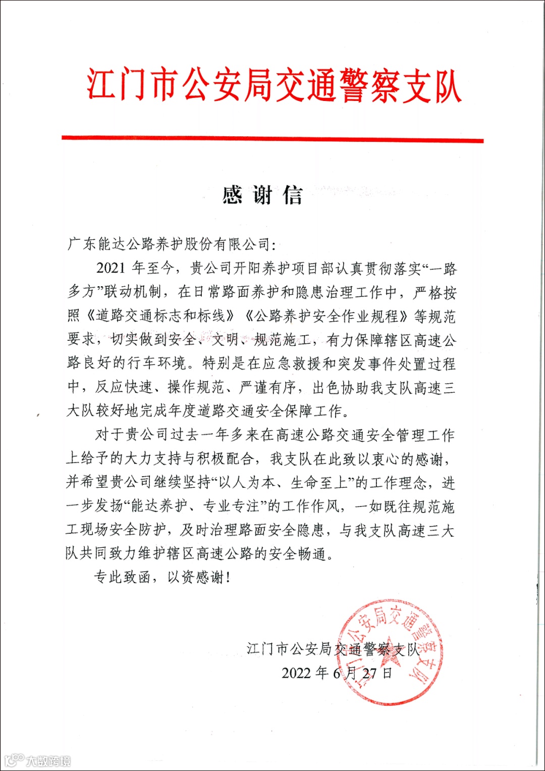 2022年6月27日,江门市公安局交通警察支队向公司发来一封感谢信,对公司开阳养护项目部过去一年多在高速公路安全管理工作,特别是在应急救援和突发事件处置中的积极表现给予了衷心的感谢,并鼓励公司进一步发扬“能达养护,专业专注”的工作作风,共同维护高速公路的安全畅通!