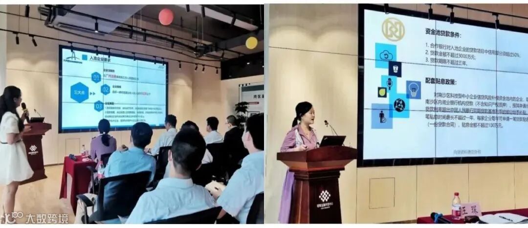 为缓解科技型中小企业融资难题,本次活动邀请资金池受托管理机构大湾区科技创新服务中心高级经理殷萍、广州市慧金信息科技有限公司资金池项目负责人王琛分别就广州市、南沙区的信贷风险补偿资金池政策进行讲解。