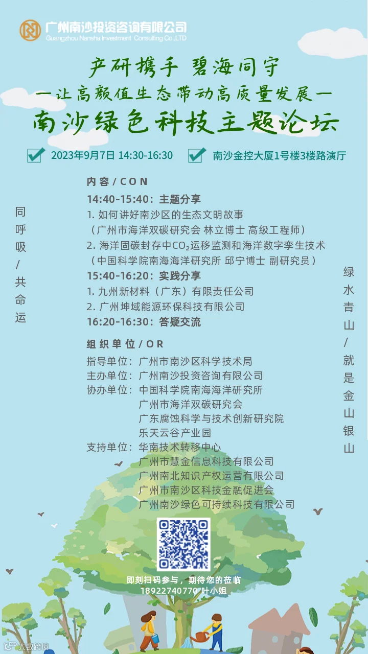 为践行绿色发展理念,助力企业把准保护与发展的平衡点,更好发挥市场主体作用,实现绿色科技的生态与经济效益,推动可持续发展的进程,为“3060双碳目标”贡献南沙力量,广州南沙科金控股集团有限公司下属广州南沙投资咨询有限公司将于2023年9月7日举办“产研携手,碧海同守——让高颜值生态驱动高质量发展” 南沙绿色科技主题论坛,诚邀各位参加!