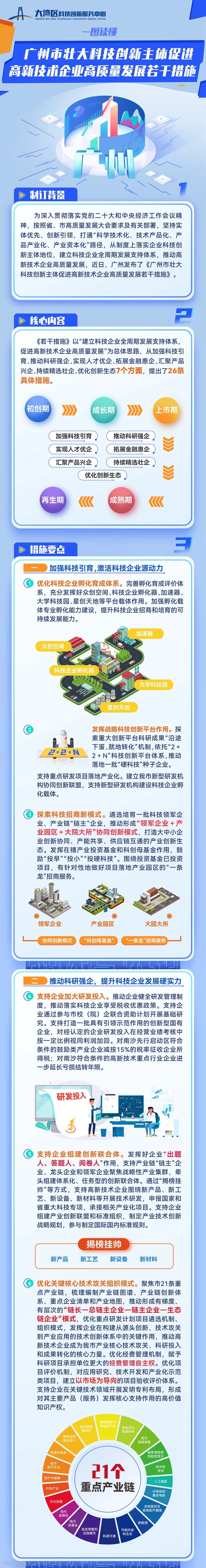 党的二十大报告提出,要“加强企业主导的产学研深度融合,强化企业科技创新主体地位”,习近平总书记强调要“发挥科技型骨干企业引领支撑作用,促进科技型中小微企业健康成长,不断提高科技成果转化和产业化水平”。为落实好创新驱动发展战略,从制度上落实企业科技创新主体地位,建立科技企业全周期发展支持体系,推动高新技术企业高质量发展,由市科技局牵头研究制定了《广州市壮大科技创新主体促进高新技术企业高质量发展若干措施》(以下简称《若干措施》),现经市政府审定后实施。