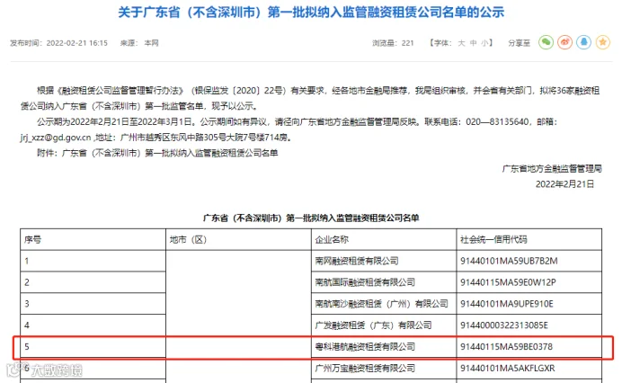 2021年2月21日,广东省地方金融监督管理局公示了广东省(不含深圳市)第一批拟纳入监管融资租赁公司名单,本会的会员单位粤科港航融资租赁有限公司成功入选。