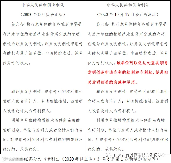可以发现,最新修订的《专利法》关于职务发明的认定基本上沿用了现行《专利法》的内容,仅第六条第1款后半段增加了“该单位可以依法处置其职务发明创造申请专利的权利和专利权,促进相关发明创造的实施和运用”这一促进科技成果转化的内容。