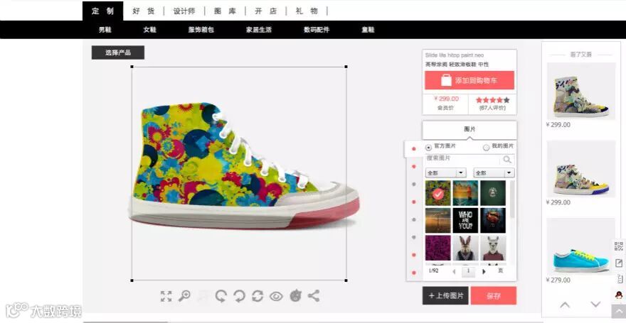 通过平台,顾客可以直接购买设计师款,也可以自己DIY。定制器经过多年研发改进已经相当灵活。以鞋子为例,用户只需要在web端点击“定制”,就可以选择鞋子款式,调整鞋面、鞋头、鞋跟、鞋带等六个部件,材质、颜色、图案都有多种备选方案。顾客也可以不用平台上的图片素材,而选择自己上传喜欢的图案运用在鞋面上,最后还可以附上个性签名。这个过程相当于把鞋子的各部分模块化,各个模块由消费者自己任意进行组合。完成设计之后用户可以下单购买这双鞋子,也能选择放弃。一双鞋子的价格在200-500之间,与那些动辄上千上万的品牌定制而言,完全属于平价商品,能覆盖到更广的用户群体。为了满足用户移动端的需求,目前App已经在测试中。
