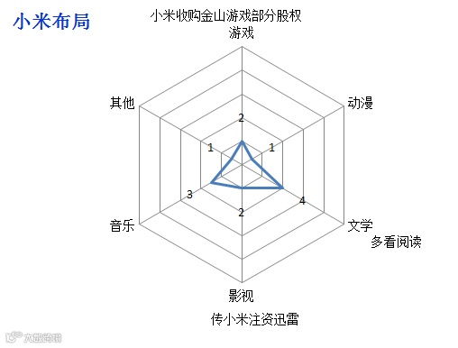 除了BAT三家,互联网平台中,小米似乎也对互动娱乐有所觊觎。去年传说小米收购了金山游戏部分股权,还有意注资迅雷,文学版块上已经有了多看阅读。虽然小米创立较晚,平台还有待于进一步巩固,但雷军的野心亦不可低估。