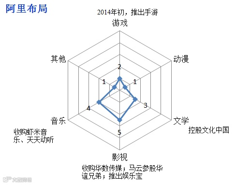 再看下阿里。相比其他两家,阿里的电商基因应该说离互动娱乐最远。但近几年阿里在这块行动较快,频频出手进行收购。先是控股文化中国,再有收购华数传媒,同时音乐端已经收购了虾米音乐和天天动听。最近收购优酷土豆,补齐其在网络视频上短板的举动更是彰显了其在互动娱乐版块发展的决心。虽然布局较晚,内在基因似乎不搭,但马云的实力不可小觑。