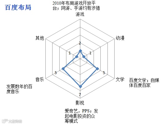 再来讲百度。虽然从基因上来看,百度以搜索引擎为主,似乎和娱乐搭不上边。但其搜索业务下,早年已经有了百度文学,百度音乐,2010年后也开放了游戏平台。网络视频方面,爱奇艺和PPS的合并,也让其即将超越优酷土豆,成为视频界老大。可以说,百度在互动娱乐版块各业务的布局还是较为齐全的,未来怎么发力还有待观察。
