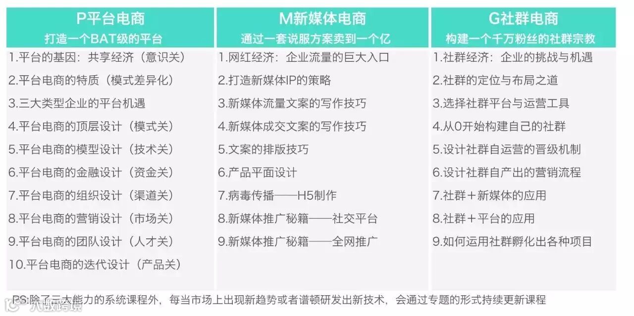 电商运营班(PMG),主讲的是术层面的知识,是电商项目在运营阶段需要掌握的3种能力如何培训操作的知识。那每门课程的每节课是什么内容?以下表格告诉你,这3种能力如何一步一步培养。