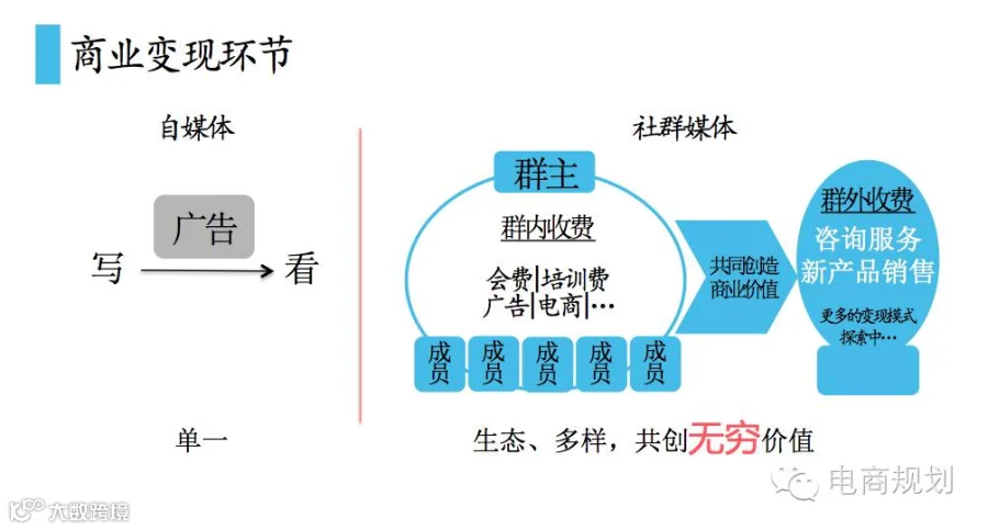 正是因为社群媒体有用户沉淀的过程,有社群的存在,所以,相对于变现无路的自媒体来说,社群媒体不必死守内容,它在商业变现上将有无限的可能。