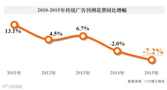 据央视市场研究报告,2015 年传统媒体跌幅创出-7.2%的历史新低,各传统媒体跌声一片。对于广告人而言,2016 年无疑有的在天堂,有的在地狱,又是跌宕起伏的一年。