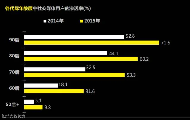 社交媒体从各个年龄层次进行渗透,80后群体增长迅速。