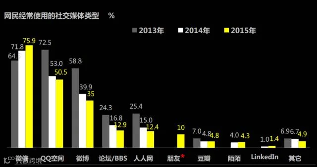 中国网民主要使用微信、QQ空间和微博三大社交媒体,其余社交媒体所占比率十分有限。