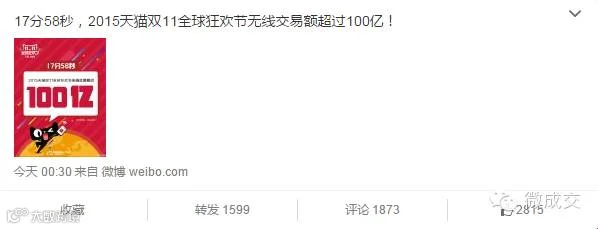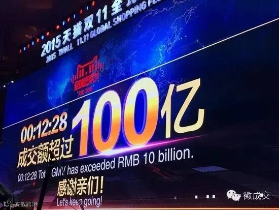 2015天猫双11全球狂欢节开始的第18秒,交易额超1亿元。