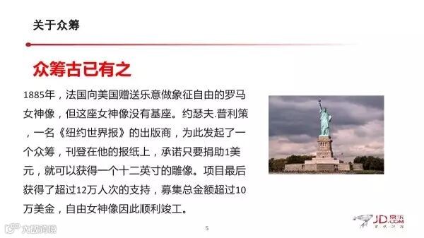 1885年,法国向美国赠送乐意做象征自由的罗马女神像,但这座女神像没有基座。约瑟夫.普利策,一名《纽约世界报》的出版商,为此发起了一个众筹,刊登在他的报纸上,承诺只要捐助1美元,就可以获得一个十二英寸的雕像。项目最后获得了超过12万人次的支持,募集总金额超过10万美金,自由女神像因此顺利竣工。