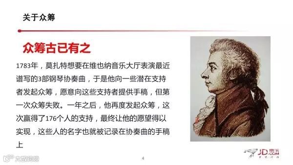 1783年,莫扎特想要在维也纳音乐大厅表演最近谱写的3部钢琴协奏曲,于是他向一些潜在支持者发起众筹,愿意向这些支持者提供手稿,但第一次众筹失败。一年之后,他再度发起众筹,这次赢得了176个人的支持,最终让他的愿望得以实现,这些人的名字也就被记录在协奏曲的手稿上