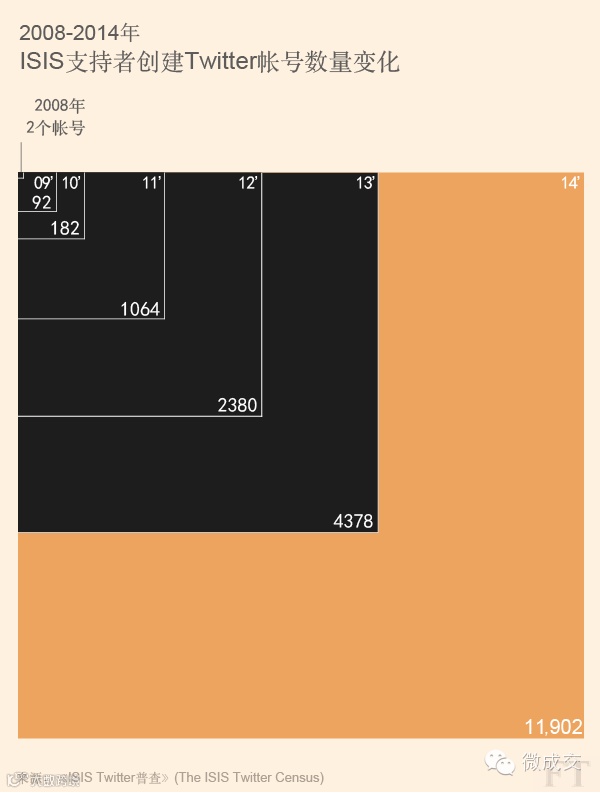 再来看Twitter上ISIS的支持者走势,自2008年ISIS的支持者首次创建帐号,至2014年底Twitter上已累计20,000个ISIS支持者的Twitter帐号,其中有近60%创建于2014年。