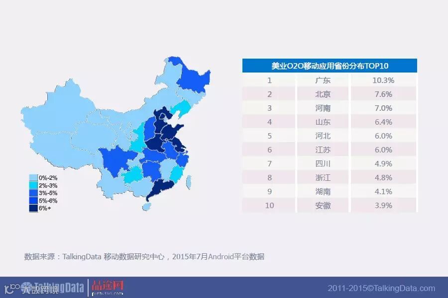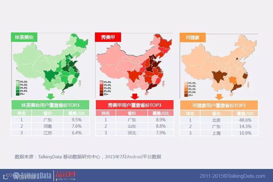 用户多分布在广东、北京等经济较发达地区。其中广东排名第一,占比达10.3%,典型应用的用户分布稍有不同,抹茶美妆和秀美甲的覆盖范围更广,而河狸家主打几个大城市。