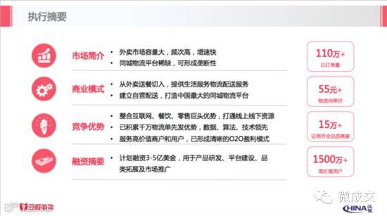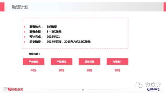 同时,百度外卖融资消息源于融资计划书曝光。百度融资计划书显示,百度预计外卖平台2015年整体交易额超过80亿,而2016年的目标是交易额超过250亿,日均订单100万单,单一配送人员日均派单20单;融资中40%用于平台建设,20%用于产品研发,20%用于品类拓展,20%用于市场推广。