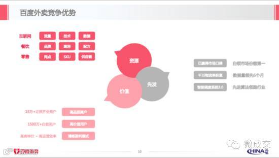 百度外卖在融资计划书中强调了其大数据能力,表示在用户和商户端采取了分级、精细化补贴和反作弊监察的手段,在物流上则使用大数据和补贴政策拓展,还强调了百度地图入口对基于地理位置的推送和数据分析能力。