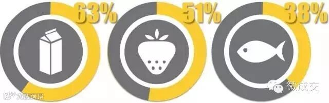 在各生鲜品类中,购买度最高的是63%奶制品,其次是51%的水果类,网购蔬菜/肉类/水产的比例合计38%。