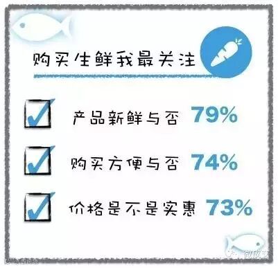 尼尔森研究显示,消费者在购买生鲜时最关注产品新鲜(79%)、购买方便(74%)和价格实惠(73%)三大因素。而消费者选择网购生鲜的三大原因有促销多(52%),有来自多种产地的产品(47%)以及进口产品多(47%)。对比常规渠道的便利性级质量有保证,生鲜电商若能加强,则还存在增量空间。