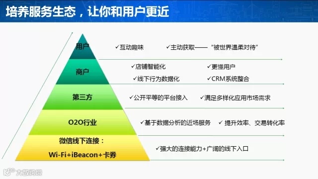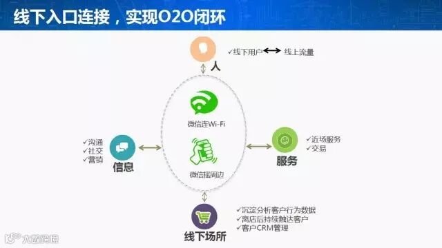 4月12日,微信公开课第二站长沙站正式开讲,在活动现场,微信团队向观众解读了微信连Wi-Fi、摇周边、微信卡包等线下连接能力如何助推“互联网+”发展,帮助合作伙伴借助微信的能力实现O2O落地。今天,小编就通过10张图,带大家一道揭秘微信O2O。1、通过微信连Wi-Fi和摇周边的能力,微信打通了“人-服务-信息-线下场所”的线下连接,商家由此获得了更便捷、精准的近场服务能力。