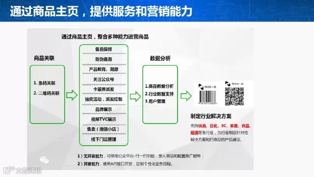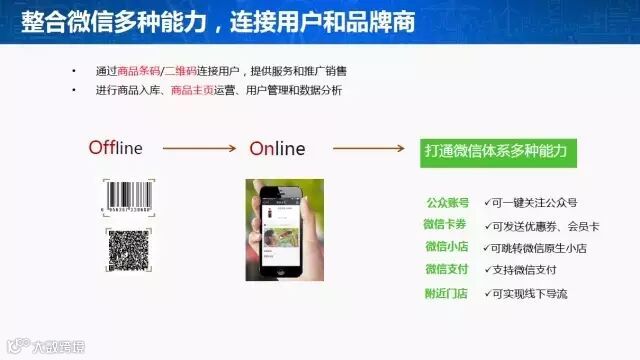 8、未来,微信“扫一扫”将整合、打通多种能力,帮助商家通过商品条码/二维码连接用户,提供服务和推广销售,更方便地进行商品入库、商品主页运营、用户管理和数据分析。