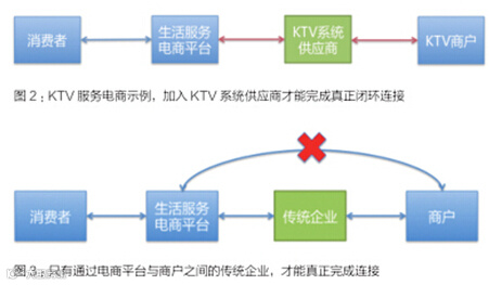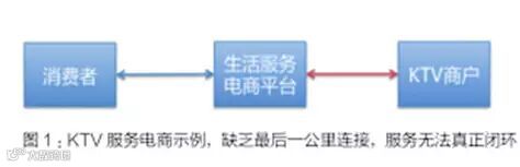 通过这个发生在身边的案例,我们可以清晰地看到,生活服务电商平台与KTV自身订房系统之间的一进一出,连接沟通不畅,就构成了当前O2O本地生活服务所面临的一个真正死穴问题,即O2O最后一公里的连接难题!(见图1)