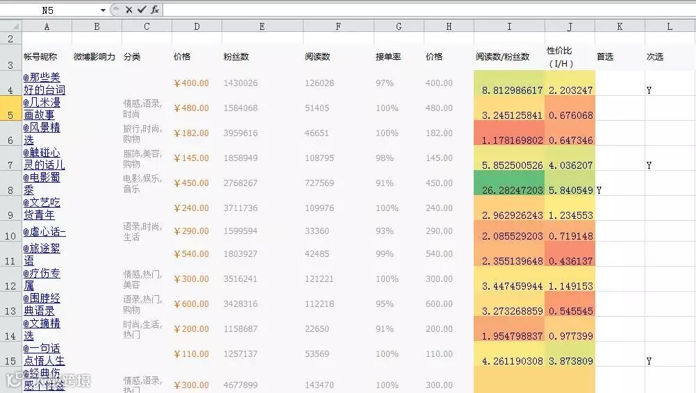 是科学筛选合适的微博大号。对于新浪微博的大号转发,首先筛选100w以上粉丝的号,类别筛选情感、语录、摄影、旅行、电影、音乐等,大约有160个微博号满足条件,之后作出下表算性价比。