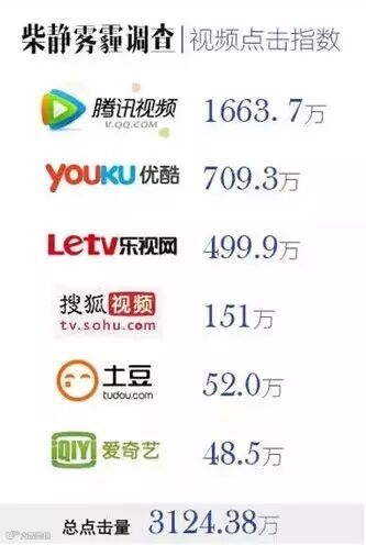 转柴静前同事核实的数据:穹顶之下今天10点推出,截止20点13分统计:优酷401万,9088条评论。腾讯2620万,32760条评论(微信拉动)。搜狐76万,172条评论。乐视305万,36条评论。爱奇艺1万,15条评论。土豆31万,1956条评论。凤凰19万,15条评论。