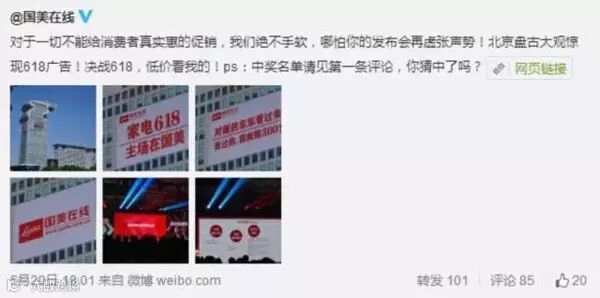 首先,北京盘古大观投放618广告:广告语火药味十足,“家电618,主场在国美”,“对面的东东看过来,贵过你,我就赔300”……这个“东东”说的是谁,不言而喻,官微中还在第五张图中加了个京东发布会的现场图,这是要闹哪样呢?重点是选择盘古大观投广告,原因也是因为京东公司就在旁边吧。这用心良苦,确实是花心思的借势营销啊!