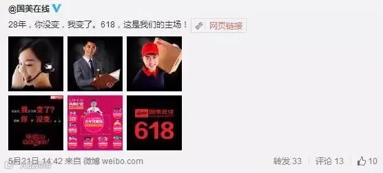 这两天关于国美在线用28年对比京东12年系列在朋友圈疯传,这样的借势是值得学习的参考的。每一家都有自己的主场,营销就是这样,前天我是418,今天你是618,明天他是双十一,总之这样电商的大战场上是不断轮换做东,借势营销就是为这场战役增加火力,用户才可以更加关注。