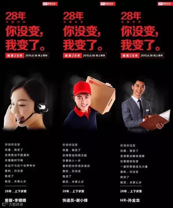 另外,针对三个代言人的直接比附:李娜、刘强东、谢霆锋的12年系列广告文艺又震撼,在这里国美在线没用明星没用老板,看到组图的是客服、HR、快递员,用一个28年系列来比附,延展的很有趣。
