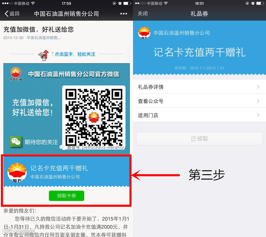 除了百货类商家,中国石油温州和湖北的销售分公司也开展了“充值送好礼”的活动,通过发放微信卡券送好礼,吸引新老客户充值消费。商家很满意粉丝增长速度和粉丝质量,认为粉丝都是目标用户——车主。对商家来说,微信卡券最大程度地解放了登记台账的问题,避免了礼品重复领取。而微信卡券的核销过程也十分简单,加油站员工使用个人微信号,即可用手机核销,不用担心占用太多时间。