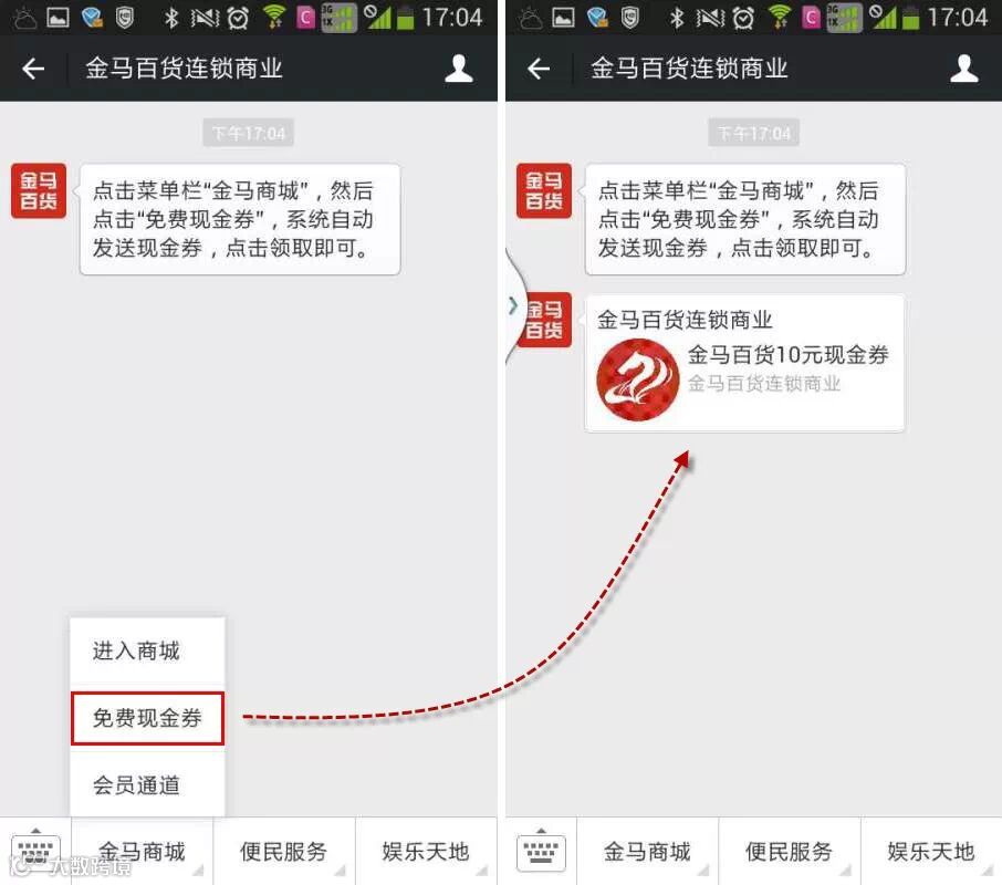 JM百货就采取了非常简单的领取方式,在自定义菜单下发领券链接,领券链路短,领券成本低,领券率高;