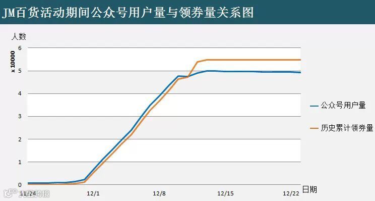 如百货类商家JM百货,在某市有7家卖场,2014年10月14号新开通公众号,至11月27号活动开始前,公众号用户依然只有个位数。通过发放微信优惠券,17天内激增5万公众号用户,且均为高价值潜在消费者,完胜满大街加公众号送纸巾的低端拉粉行为。