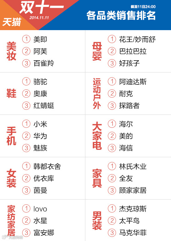 从品类上来看,美即、骆驼、小米、海尔等品牌分别占据了美妆、鞋、手机、大家电等类目的头名。