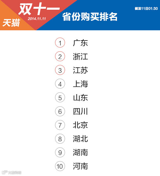 在今年的双十一中,消费最多的省份是是广东,排在第二和第三的是浙江和江苏,此外上海、山东、四川、北京、湖北、湖南和河南也进入了本次双十一网购省份的TOP10。