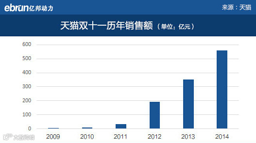 与2013年双十一相比,今年的天猫双十一,销售额上涨了超过200亿,而超过2012年的192亿仅用了7个小时。