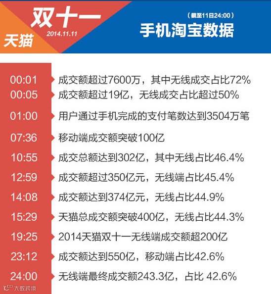今年的双十一,移动端全面爆发,无线端的最终成交额约为243.3亿,占比达到42.6%