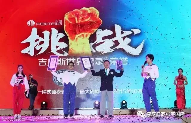 活动现场,芬腾成功刷新了2项吉尼斯世界纪录荣誉,分别是“最大的睡衣”、“最多人穿一件式睡衣聚会”。