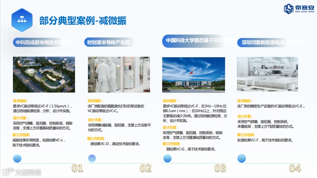 帝赛安科技的技术源自于国内领先的高端抗震减震专业领域的国家高新技术企业—盛年科技有限公司,盛年科技经过多年技术攻关,成功突破了超低频振动控制的技术瓶颈,实现了三大技术突破:超低频启振技术 :将起效频率下探至 0.5Hz,解决了传统隔振装置在 8Hz 以下频率区间几乎无效的行业难题。这一突破使得芯片光刻机、电子显微镜等对低频振动极其敏感的设备获得了有效的保护。宽频带高效控制 :采用独创的多级阻尼设计,在 0.5-100Hz 全频率范围内实现90%以上的振动控制效率,远超国际同类产品 70%的平均水平。智能自适应系统 :通过内置传感器实时监测环境振动状态,自动调整阻尼参数,确保在不同工况下始终保持 VC-G 级的控制效果。