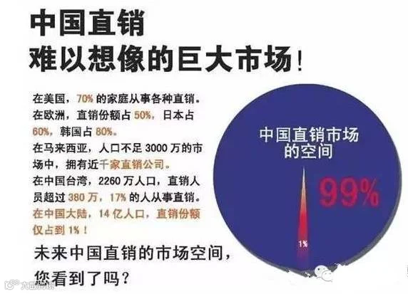 到2004年中国的直销市场达到300多亿, 2014年超过1500亿,2015年直逼2000亿。做直销最大的优势,就是不受区域限制,中国14亿人口,你在哪里,生意就做到哪里。