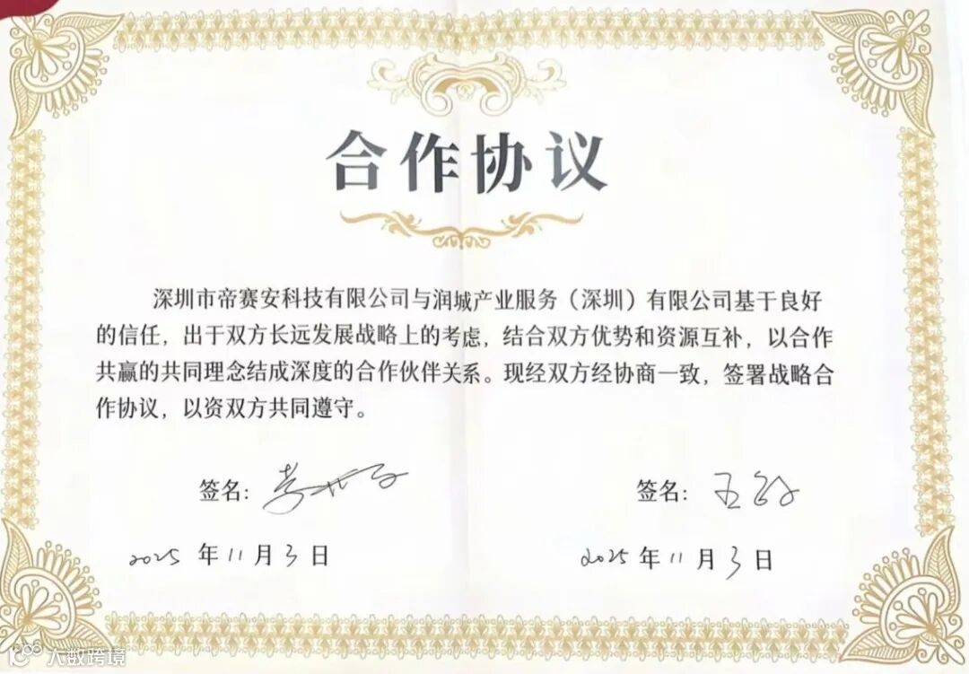2025年11月3日,深圳市帝赛安科技有限公司(以下简称“帝赛安科技”)与润城产业服务(深圳)有限公司(以下简称“润城产业”)在深圳签署战略合作协议。双方将以新一代信息技术、智能智造、新能源新材料、产业基建等领域为战略合作切入点,重点在数据中心、算力中心、半导体精密设备、建筑机电、重点实验室等产业板块深化业务拓展,推动精密设备安全与科研环境防护的技术革新。