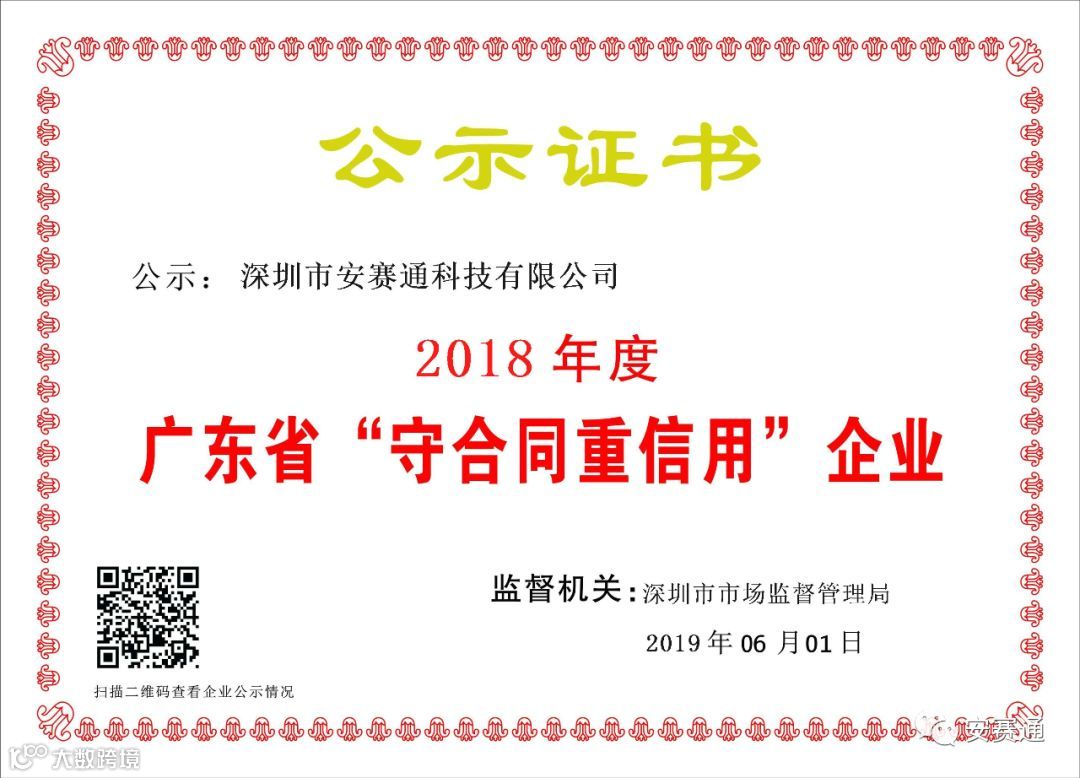 经深圳市工商行政管理局审核批准,深圳市安赛通科技有限公司荣获“2018年度广东省守合同重信用企业”称号,并获得了荣誉证书。