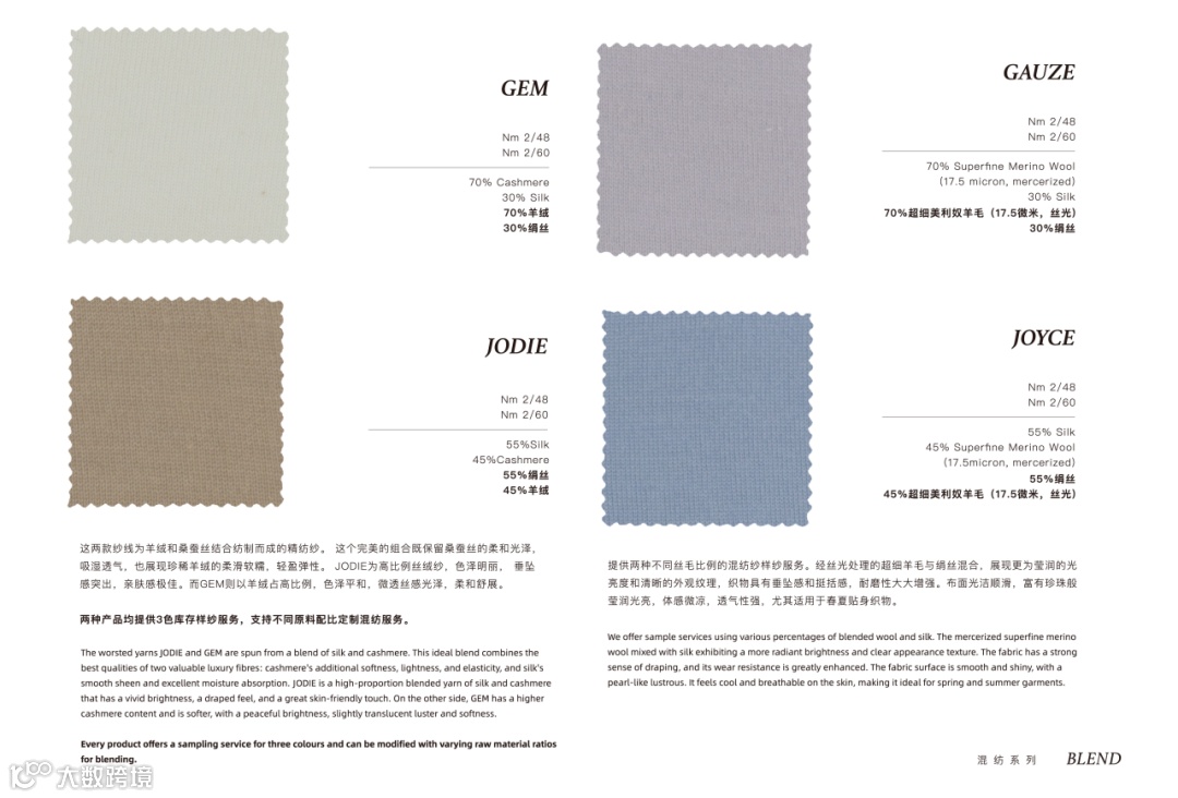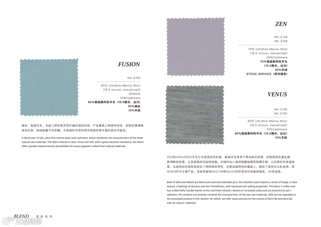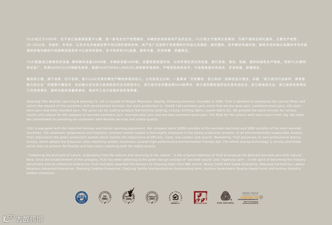 公司成立于2001年,是一家专业生产经营精纺、精半纺毛纺织品、针织品用纱的企业,拥有先进精纺设备15000纺锭,精半纺设备5000纺锭。主要生产经营:20-120公支,羊毛纱、羊绒纱、毛绒、丝绒等混纺纱。