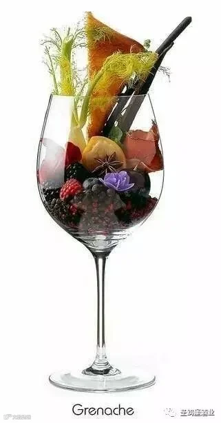 歌海娜葡萄品种: 黑樱桃,黑莓,树莓,蓝莓,小茴香,檀香,玫瑰花瓣,紫罗兰,香草豆,八角,黑胡椒,烤面包,烟熏火腿。