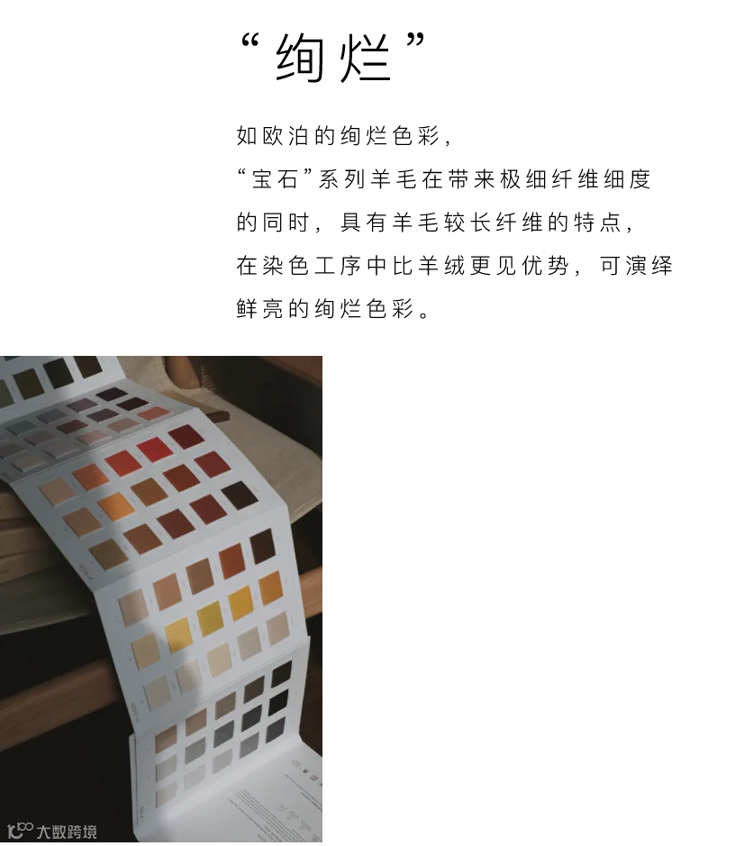 YILEI推出“宝石”羊毛系列纱线,以13.5微米和14.5微米等级的超细支美丽奴羊毛作为原料,精密制造高支精纺纱线,为四季高端服饰提供更多优质选择。