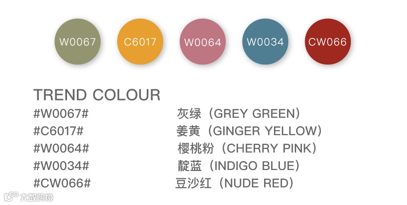 灰绿、姜黄、靛蓝、樱桃粉、豆沙红这组复古色系是经过岁月沉淀后呈现出的年代感。灰绿与樱桃粉相互有序的交错着,结合大面积的靛蓝色,褪色做旧的质感,仿佛是时代留下的印记。豆沙红和姜黄自带复古的情绪,加入时代的滤镜,一一展现自身色彩独有的魅力。